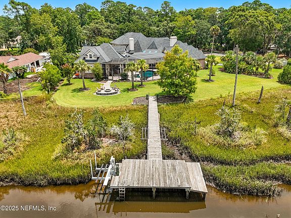 Bring your paddleboards and jet skis and and enjoy this exceptional brick 6 bedroom, 5.5 bath pool home in sought after Marsh Landing Country Club. This spacious home sits on just shy of an acre of property with a dock & boat lift for access to Cabbage Creek & the Intracoastal Waterway. The main house boasts 5 bedrooms with the primary with vaulted ceilings on the first floor, oversized Florida room overlooking the heated saltwater pool, summer kitchen and expansive decking, as well as a first floor bedroom, perfect for a guest suite or office. Upstairs are three large bedrooms and two baths. The air conditioned gym and guest cottage (6th bedroom) are connected to the main home by a stunning screen enclosure, housing a full pool bath downstairs and a half bath upstairs. Perfect for indoor/outdoor entertaining and enjoying incredible sunsets, this is home is a must see! Roof is 2 years old. Conveniently located close to the beach, shopping, JTB, the Mayo Clinic, and Sawgrass TPC.