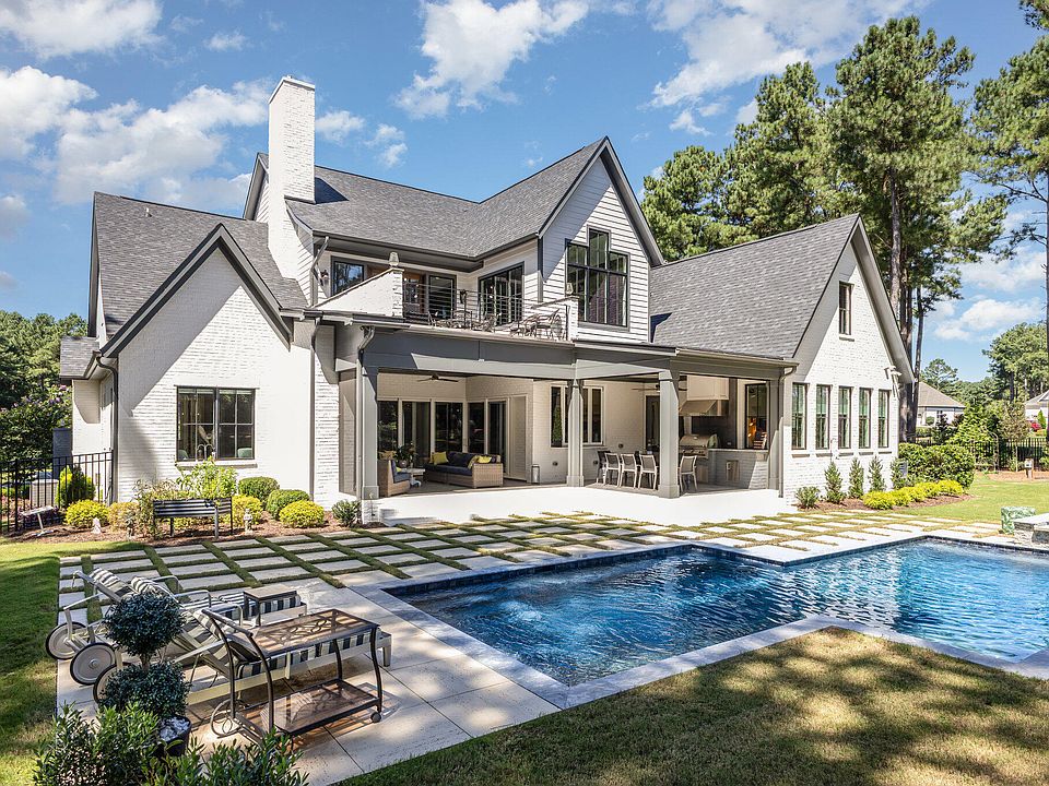 North Raleigh's Premier Luxury Residence - Modern Farmhouse Elegance Meets Contemporary Design. NO NEED TO WAIT FOR BUILDER COMPLETION! The owners of this recently built North Raleigh gem have poured their passion for graceful living and entertaining into creating this incredibly unique custom luxury home. This expanded and customized AR Homes Fontainebleau Plan is located in Montreux, rarely available and certain to move quickly, this breathtaking modern farmhouse offers unmatched sophistication in one of the area's most sought-after neighborhoods. With over 220 square feet of covered outdoor living, this home lives far larger than its footprint . A gorgeous setback and walk-up lead to the covered entry and striking iron-and-glass double door. Inside, the foyer soars with volume, wrapped in custom shiplap and crowned by a motorized chandelier, with floor-to-ceiling windows filling the home with natural light. A steel-and-hardwood floating staircase rises into 30-foot ceilings, framing views of the resort-style heated pool and spa with cascading waterfall, butterfly garden and dramatic concrete and grass checkerboard terrace all set within lush landscaping on a manicured acre-plus lot for family and pets. The home feels much bigger due to the 2280 sq. ft. of covered veranda outdoor space. Exposed beams bring warmth to the open main floor, where the private owner's suite spans the entire side of the home. Its art-deco-inspired bath blends elegance and spa-like serenity with temperature controlled floors, dual vanities, soaking tub, massive walk-in shower, and custom closet with built-ins, chandelier, and dressing island. A tranquil guest suite with en suite bath, walk in closet is also on the main level. The chef's kitchen features custom cabinetry, Monogram built-in refrigerator and double gas oven, and a reclaimed wood and Silestone island with antique brass lighting. Cleverly designed into the cabinetry, the butler's pantry is discreetly located behind a pantry sink counter space and supplemental refrigerator and dishwasher makes the end of the day entertaining a breeze for preparation and cleanup. A glass-and-brick wine room and built-in beverage bar flank the dining area with unique designer lighting, while the living room centers on a natural brick fireplace with custom built-ins. Vanishing glass sliders open to a covered lounge with porcelain tile, shiplap ceilings, gas fireplace, grilling station, and alfresco dining, all protected by Phantom screens. A tiered office with custom wall design and seven windows creates a serene work-from-home retreat, while a sleek pool bath and designer mud/laundry room add convenience. Upstairs, the club room boasts cathedral ceilings with massive beams, a wet bar with custom cabinetry, modern shelving, and access to a 20x40 veranda for morning sunrises or evening entertaining. A private fitness room with AV setup and serene forest views sits nearby. The ''younger generation wing'' offers 2 bedrooms (one with en suite bath), another full bath, a flex space for study or gaming, and walk-in closets, with unfinished storage for future use. Outdoor living is reimagined with multiple covered lounges, fireplaces, firepit, terrace, and the spectacular pool and spa—perfect for year-round entertaining. Oversized 3 car garage, pre-wired for electric vehicle charging, with additional expanded parking pad, ideal for golf carts or additional guests. A fully fenced backyard with 3 custom entry gates and full perimeter video surveillance system for both beauty and security. Every detail, from handcrafted millwork to exposed beams and designer lighting, has been carefully curated to create a home of enduring beauty and sophistication. This is not just a residence; it is a lifestyle retreat for those who expect nothing but the best.