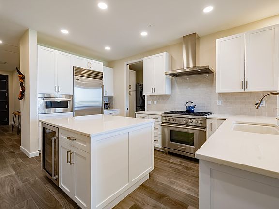 Storefront windowsSleek shaker style cabinetryWood plank porcelain tileQuartz countertops