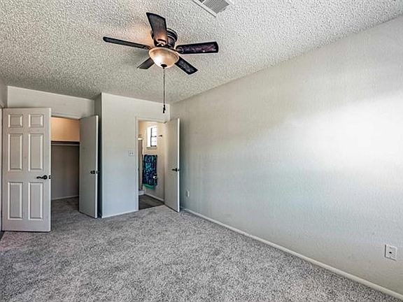 3 bedroom 2 bath, the living room has wood floors and woodburning brick fireplace. 2 guest bedrooms to the left with full guest bath. Each guest room has wood floors, ceiling fans, and step-in closets.Right side off living room enters into dining area with wood laminate floors, solid surface kitchen countertops, breakfast bar, recessed doublesink, newer fixtures, Off dining, is master bedroom with walk-in closet and en-suite 3/4 bath. Off kitchen, is the utility room with washer/dryer and pantry that leads to back yard. Concrete porch with grassy area transitioning into xeriscape.