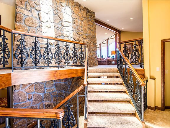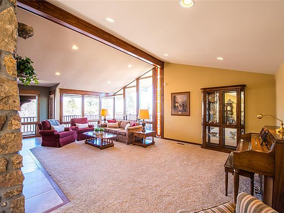 Beautiful updated home with panoramic views of the mountains and the city from the living room and decks which wrap around the home. The lot is over 1/2 an acre covered with trees to create a quiet park-like retreat with lots of privacy. The front door has a beautifully colored stain glass window above it. The entrance is exquisite with a black iron railing from the Old Antler's Hotel downtown. The entrance opens into a gorgeous rock fireplace wall, it is the side of the gas fireplace for the living room and dining room. The high vaulted ceiling in the living room allows for displaying a beautiful stain glass window in the living room. The kitchen and dining room have been remodeled with maple cabinets, granite countertops and wood floors. The master bedroom has a sitting area with a gas fireplace and its own walk-out patio.