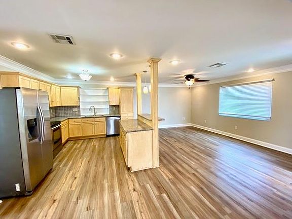 Welcome to your new oasis! This raised contemporary 3 Bedroom & 2 Bath home, is set on a generous 55 x 110 ft lot, offers modern living with a touch of elegance. Step inside to discover an array of high-end upgrades designed to impress. The open floor plan is complemented by recessed lighting and engineered flooring, creating a seamless flow throughout the living spaces. The kitchen is a chef's dream, boasting stunning granite counters and beautiful cabinetry that offer both style and functionality. Relaxation and outdoor living are at the forefront of this home's design. Enjoy tranquil mornings on your covered front porch, or host gatherings on the large rear patio, great for entertaining family and friends. The attached garage adds convenience and ample storage space.