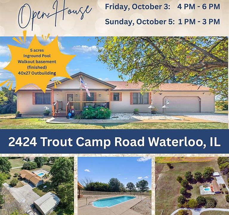 Welcome to 2424 Trout Camp Road in Waterloo, IL! Set on 5 serene acres with tree-lined frontage, this 3-bedroom, 3-bath home offers the perfect combination of country privacy and modern updates. Outdoor Living at Its Best!!The star of the property is the inground fiberglass pool (new pump 2023, heater hookups ready) – just in time for summer fun. A 14x50 deck spans the back of the home, overlooking rolling fields and breathtaking sunsets. Stylish & Functional Interior: