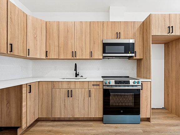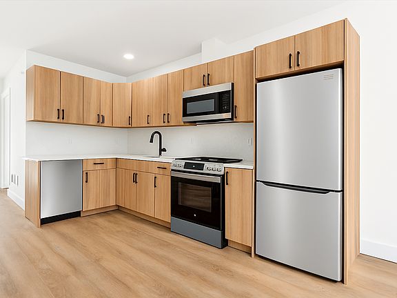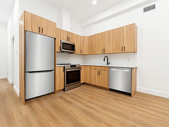 Step into this modern second-floor apartment featuring an open-concept kitchen and living area with beautiful wood cabinetry, quartz countertops, and full stainless-steel appliances including a dishwasher and garbage disposal.