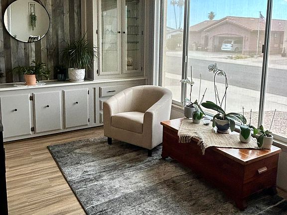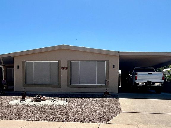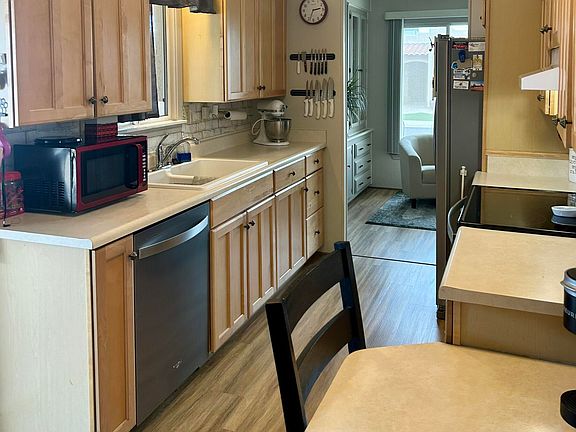 Welcome to this mobile home nestled in a 55+ community great for snowbirds! Rentals over 30 days are allowed, and the land is owned as an attached manufactured home. You'll love the front covered patio ideal for enjoying your morning coffee. Discover a bright interior with wood-look floors, a spacious living room, and two sizable bedrooms. A bonus/office space is available at home as well for convenience! The kitchen includes built-in stainless steel appliances, honey oak cabinets, and ample counters. In the backyard, you'll find a paver seating area and artificial turf for relaxing evenings. Enjoy the community pool, spa, fitness center, tennis courts, and more. Don't wait any longer!