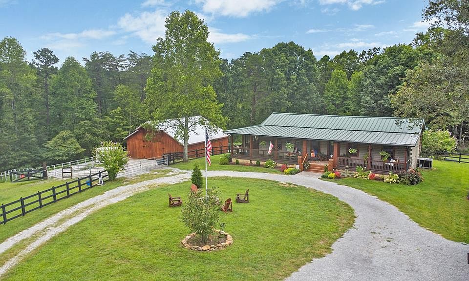 Welcome home! A hidden gem tucked away with lots of privacy 10 level to rolling acres. This has everything you could ever want. LOG HOME LOVERS check this one out. Spacious 2 bedrooms 2 bath (Jacuzzi and walk in shower)with split open floor plan. Cathedral ceilings, gleaming hardwood flooring, chefs kitchen with huge island and walk in pantry everything at your fingertips, all appliances convey. Enjoy dinner in your spacious sunroom or screen-in porch or covered 'front rocking chair' porch. Crawl space completely encapsulated with an installed dehumidifier. Anyones huge dream 2 car garage/workshop 46x38 has 8 inch concrete, plus RV hookup and additional overhead storage. Beautiful barn is 36x36, barn with 3 stalls currently and room for additional 2 stalls room if needed, tack room and upstairs hay storage, lighting and water, and storage for equipment on each side of barn. Pasture fenced and cross fenced just awaiting your beauties. Also has a storm cellar. Too much to mention