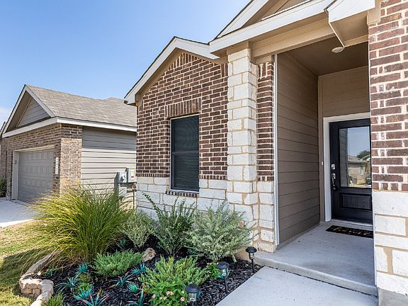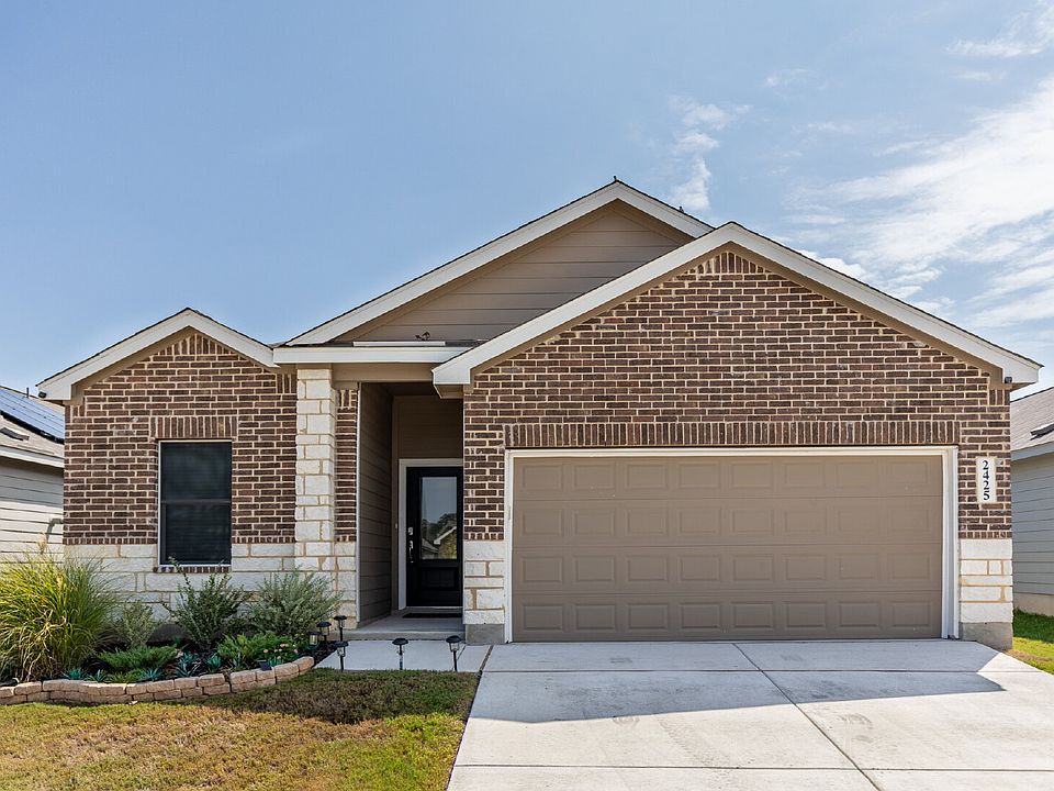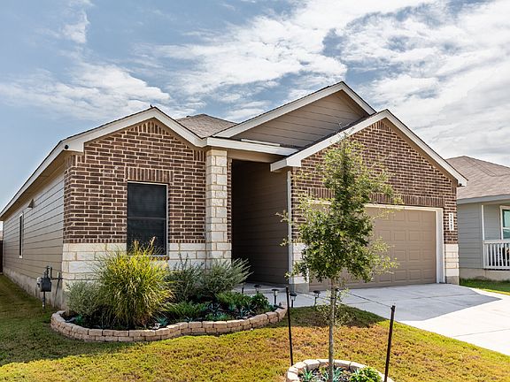 Built in 2023, this home just 10 minutes from the heart of New Braunfels offers all of the modern comforts you're looking for in a new build, plus a few extra bells and whistles! With 3 bedrooms and 2 baths, this split open floor plan is designed for both relaxation and entertaining and truly shows like a model home. New bathroom mirrors and custom tile showers, along with a new back door all add a touch of luxury to the home, while the blinds and solar screens throughout keep your utility bills low. Outside, you'll love the covered back patio with added lattice for privacy, perfect for enjoying quiet mornings or evenings under the stars. The landscaping and sprinkler system are already in place, so you can focus on enjoying your space, not maintaining it! To top it off, just around the corner is a resort-style pool, playground, and running trails. This truly is a rare find and a fantastic neighborhood lifestyle.