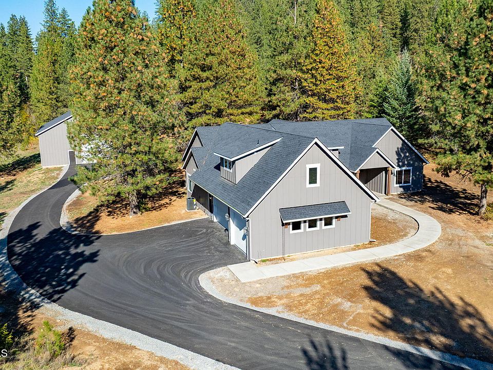 Nearly completed new construction on 5 acres with shop. This custom floor plan featuring 3,300+ sq ft offers 4 bedrooms, 3.5 bathrooms with upgraded design finishes and elements throughout. Features include knotty alder stained trim, custom stained soft-close cabinetry, quartz countertops, farm sinks, Thermador appliance package with 48'' range, Matte black fixtures and finishes, water resistant laminate flooring, propane gas fireplace, central air conditioning, expansive glass sliding door connects interior to covered vaulted outdoor patio. Includes front and rear landscaping and sprinklers. Shop features 2,400 sq ft, 18' x 14' garage door. Easy access to Hwy 95 and surrounding recreational areas.