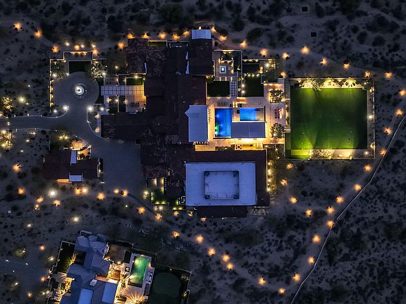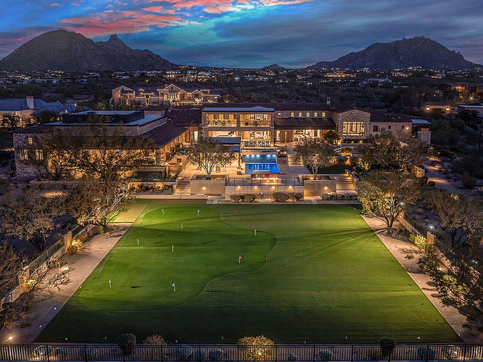 HOUSE COMES FULLY FURNISHED HardtSeasons is a breathtaking estate situated on nearly 5 acres in the prestigious Prado Estates of N Scottsdale. Designed to provide unmatched privacy and exclusivity, the property offers sweeping mountain and city views, capturing Arizona's most spectacular sunsets. The main residence combines luxury and comfort with 5 spacious main bedrooms and 18 elegant bathrooms. Built 7 years ago, the home features an abundance of natural light and seamless indoor-outdoor living. The estate is an entertainer's dream, boasting two resort-style pools, outdoor TVs, and a full bar with dramatic fire and water features. The formal living room, with its soaring ceilings and expansive windows, provides a perfect space for year round elegance festive holiday celebrations.