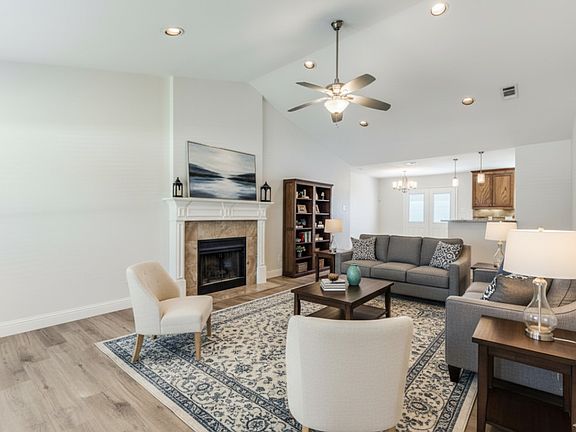 Modern light fixturesStylish shuttersCozy central fireplacePainted privacy fenceCompletely refreshed landscapingPlush new carpetFresh neutral-tone paint
