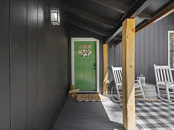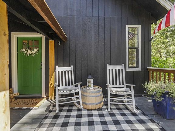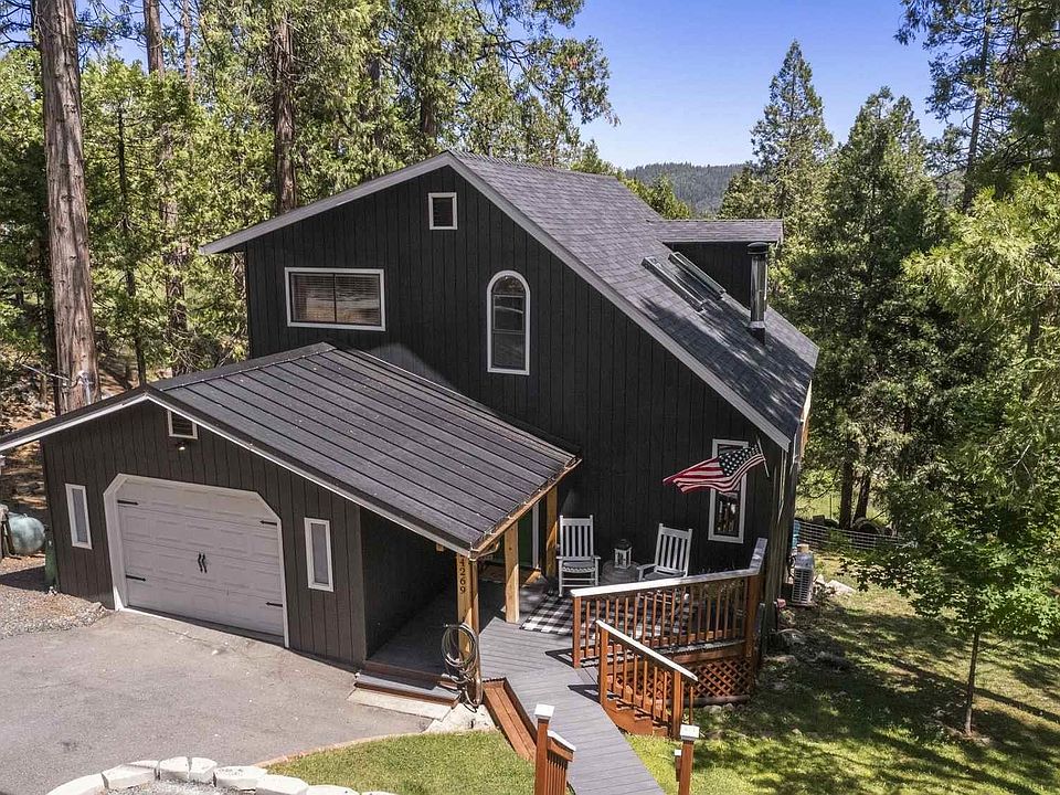 LET'S GET MOV'N! Charming Mi Wuk Village cabin with shabby chic touches throughout including recently painted black exterior with metal roof and copper gutters. SPACIOUS 2 Bed 2 Bath with UPSTAIRS LOFT. Kitchen overlooking mountain landscape with newer flooring, stainless steel appliances, newer paint and stylish CONCRETE COUNTERTOPS with subway tile backsplash. Updated bathrooms - modern, bright white accents with rustic touches throughout. Chunky wood mantle with floor to ceiling fireplace stone and freestanding heat stove. LIGHT + BRIGHT interior with SOARING ceiling in living room. Back deck - great for ENTERTAINING with WOOD OVERHANG equipped with overhead fan and outdoor tv. TREE VIEWS from every window. JACK & JILL BATH upstairs. LEVEL ENTRY. Adorable!