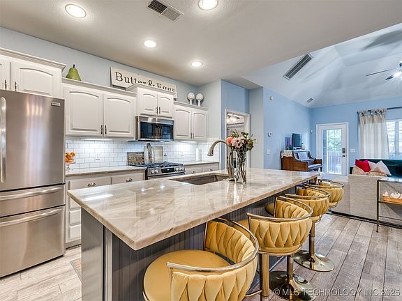 Welcome home to this well-maintained and updated home in the desirable Woodcreek Villas in Jenks. New Roof, blown-in attic insulation, appliances, and much more for added peace of mind. On the first level, you'll find an updated kitchen topped with Quartzite countertops and all-new appliances. Half bath perfect for guests is connected to a separate laundry room. Living area with vaulted ceilings and a corner point fireplace with fresh tile and backdrop. A generous Primary suite featuring a tray ceiling with ambient lighting, a whirlpool soaking tub, and a separate shower with walk-in closet. As you head upstairs, you will discover a perfectly cozy reading nook joined to the game room or second living area. Combine with two additional bedrooms, a full bathroom between them, and access to attic storage. Backed to a greenbelt and easy to maintain yard features full privacy fencing, covered front porch, and back patio with added decking/pergola. 2 Car garage with added storage cabinetry and epoxy flooring. The neighborhood is conveniently located with easy access to Highway 75 and connected to Jenks West Campus by sidewalk for stress-free drop-off/pickup. Enjoy the available neighborhood pool, park, soccer field, holiday/social events, and flock security connected to Jenks PD.