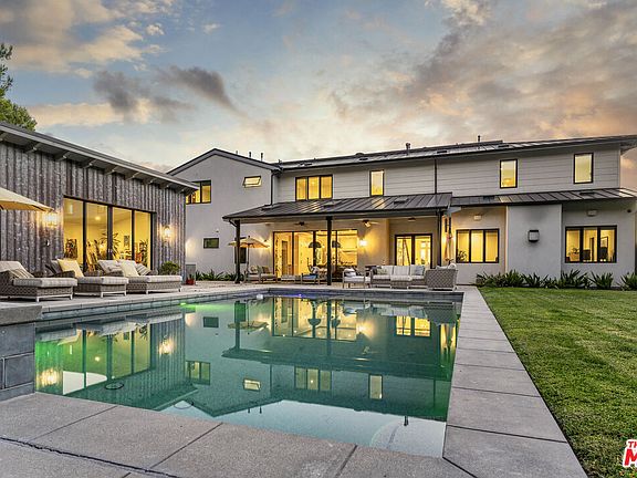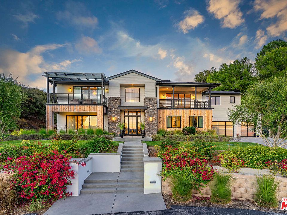 Nestled within the scenic rolling hills of Calabasas, this exquisite modern farmhouse redefines luxury living. This home is also listed for sale, available furnished or partially furnished. Spanning over 2 acres of lush flourishing land, this estate seamlessly blends contemporary elegance with natural beauty, offering an unforgettable retreat. From the moment you step into the striking foyer, you're captivated by the soaring volume ceilings, an abundance of natural light pouring through expansive windows, and the warmth of wide-plank white oak floors that flow throughout the home. The formal living room exudes sophistication, while the superb office space and inviting great room are anchored by a sleek, modern fireplace. The state-of-the-art kitchen is a chef's dream, boasting top-of-the-line Thermador appliances, a subway tile backsplash, shiplap accent walls, and a butler's pantry that conveniently opens to the outdoors; perfect for effortless year-round al fresco dining. Upstairs, discover three generously sized en-suite bedrooms and a versatile bonus room with an attached balcony. The primary suite is a true sanctuary, offering breathtaking views of the surrounding hills. The spa-inspired master bath features dual walk-in closets, a soaking tub, and a stunning double-sided shower that epitomizes luxury. The rear grounds are an entertainer's paradise, complete with a cabana featuring a private bathroom, an outdoor grill station, and a sparkling pool and spa. Whether hosting gatherings or enjoying quiet evenings under the stars, this property is designed for seamless indoor-outdoor living at its finest.