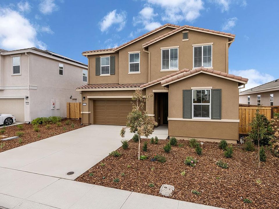 This charming Tuscan-style two-story home is in, Terra at Villa Ticino, a new community near parks with playgrounds, sports courts, and scenic trails. Commuting is made easier with nearby access to Hwy. 120, I-5, and Hwy. 99. Enjoy shopping at the Promenade Shops at Orchard Valley, family fun at Great Wolf Lodge® in Manteca, and water recreation along the San Joaquin River. Inside, the open-concept floor plan showcases 9-ft. ceilings, a spacious great room, and a first-floor bedroom perfect for guests. The kitchen offers neutral light brown-stained cabinetry, quartz countertops, and a central island for meal prep and casual dining. Upstairs features a versatile loft, convenient laundry, and primary suite with a generous walk-in closet. Energy-efficient features include WaterSense® fixtures, low-E windows, a smart thermostat, electric water heater, and Whirlpool® appliances. Don't miss your chance to own a beautiful new home designed for comfort and convenience.
