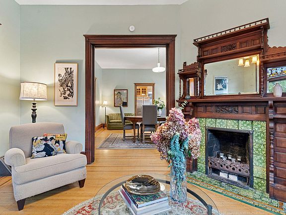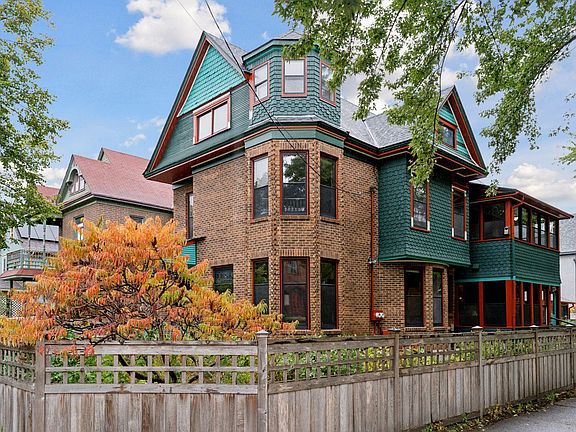 One to see! Landmark tri-color and brick Queen Anne home in the popular Seward neighborhood. Built as a duplex, but lived in as a single family home for decades, this house offers many creative spaces. The historic palette of amber and sage colors in the living spaces draws inspiration from the stained glass transom window in the living room. Original character abounds: pocket doors (with two different woods to match their respective facing rooms) with intricate hardware, hardwood floors with inlay, decorative fireplace with embossed ceramic tile and Eastlake carved wood. The dining room is large, with a bay of windows, just some of the set that have been preserved and reconditioned throughout the home. The kitchen has glass-front cabinets and newer stainless steel appliances, and a sweet breakfast nook for a quick bite. The main floor also features a bedroom, used as an office, which would make a great guest room, adjacent to the main floor full bath. The three-season porch off the kitchen is a great spot to catch the morning sun with your coffee. The front entry's fabulous staircase calls you upstairs to the casual living areas - a central family room, and three more bedrooms. The front bedroom, with its walk-in closet, can be closed off with French doors, and enjoys the morning sun in its turreted nook. The other two bedrooms share a jack and jill full bath, with clawfoot tub. The duplex's former kitchen has long been used as a second floor laundry, convenient with the original cabinetry and closets to accommodate linens and supplies. Just off the laundry room is a large porch, a great spot to perch up above the street and spend summer evenings. The fun third floor is yours to imagine...rec room, playroom, home office, or the beginnings of a primary suite. A Great space! The full basement is home to the still separate mechanicals, and if a future owner wanted to convert the home back to a duplex, the basement is plumbed from the original laundry. Otherwise, hobbyists will appreciate it for workspace or storage. Appreciate a newer roof, reconditioned original windows, sewer line work, and freshly painted exterior. The side and back yards are fully fenced and home to established perennial gardens and a paver patio for fire pit and grilling. Double garage with additional offstreet parking pad. Just blocks from Seward's Main Street with restaurants, Seward Co-op, shops and services, pedestrian mall Milwaukee Avenue, and of course, the Mississippi River, the walkability and bike-ability is outstanding.
