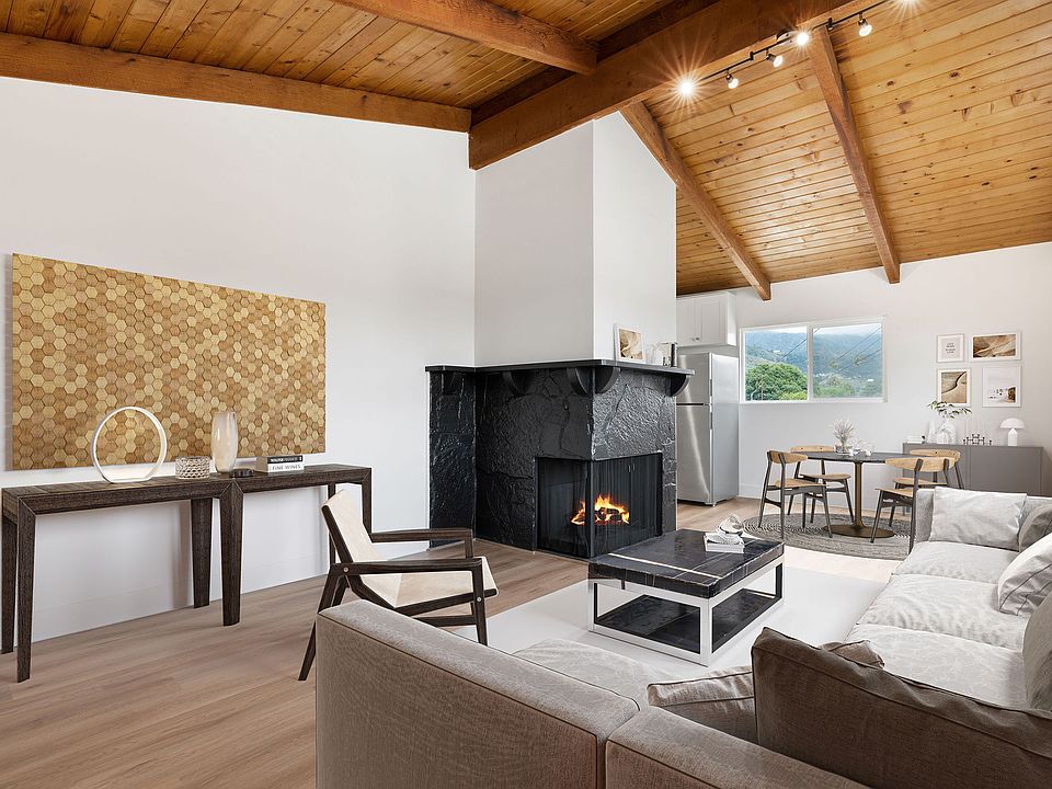 Inside, you'll find a bright, open living area with a crisp, modern aesthetic, stunning wooden vaulted ceilings, and thoughtful upgrades throughout. The renovation delivers a clean, contemporary feel that's both stylish and comfortable. The spacious bedroom is filled with natural light and offers plenty of room to relax, while the updated bathroom features sleek finishes that elevate your daily routine.