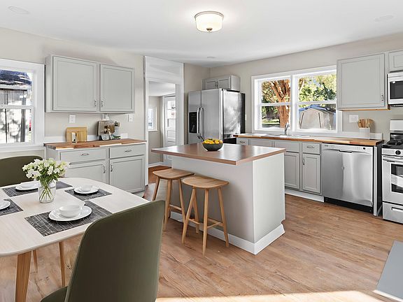 Fully Remodeled Home on an Oversized Corner Lot! Welcome to this beautifully remodeled 2-bedroom home that feels far larger than expected, thanks to its open-concept layout connecting the kitchen, dining, and living spaces. Every corner of this home has been thoughtfully updated to provide both style and comfort. Step into the spacious kitchen, featuring tons of cabinets and countertop space, plus a center island with an overhang-perfect for pulling up a few stools for quick meals or casual conversation. The kitchen flows seamlessly into the living and dining areas, making it ideal for entertaining or family gatherings. The extra-large bathroom includes a dual vanity setup-one side perfect for use as a convenient changing station or additional counter space. Just off the hallway, a flexible open storage area offers the perfect spot for a large pantry or additional shelving-ideal for food storage or organization. Enjoy peaceful mornings in the fully enclosed front porch, lined wall-to-wall with windows for natural light and a relaxing atmosphere. Outside, the extra-large corner lot provides abundant yard space, while the 1-car garage offers secure parking or workshop potential. And one of the biggest highlights-a long-lasting metal roof known for its exceptional durability and low maintenance-gives peace of mind for decades to come. If you're looking for a move-in ready home with space, updates, and lasting quality, this one checks all the boxes!