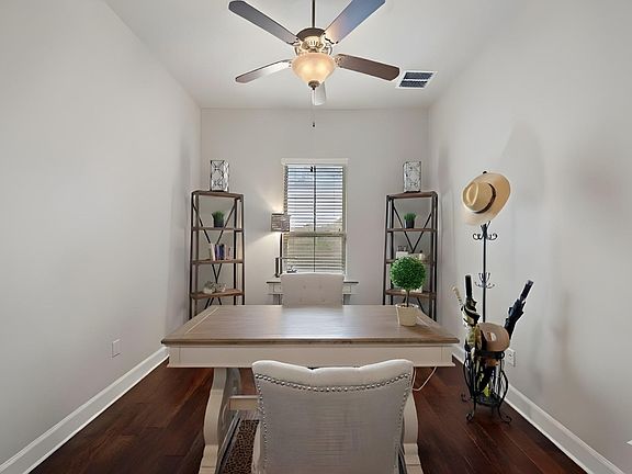 An elegant and sophisticated home awaits in the highly desirable Palmera Ridge community. This stunning single-story residence blends timeless design with modern comfort, offering a spacious open floor plan and soaring ceilings that fill the home with natural light. The great room serves as the heart of the home, featuring custom built-in bookcases, a gas fireplace, and a discreet surround sound system, creating the perfect space for everyday living and entertaining. The semi-open dining room impresses with a beautiful wood-beam ceiling, while the gourmet kitchen is a chef’s dream with rich Alder cabinetry, sleek granite countertops, E-STAR Qualified appliances, a large pantry, and a breakfast bar. Wood flooring flows throughout the main living areas, complemented by tile in the baths and laundry room. With four spacious bedrooms, including two luxurious primary suites, the layout is ideal for multi-generational living or hosting guests. The main suite offers dual walk-in closets—one with direct access to the laundry room—and a spa-like bath with an oversized shower with dual showerheads and a deep soaking tub. A bright office with French doors provides an inspiring workspace or flex room. Modern upgrades include a whole-house HEPA air filtration system, dual tankless water heaters, and a two-car garage with attic storage. Outdoor living shines with covered front and back porches, a built-in BBQ and smoking station with a Big Green Egg, and a fenced garden or pet area. Enjoy resort-style amenities, parks, trails, and top-rated schools—all within Palmera Ridge. ***Mortgage savings may be available for buyers of this listing. Inquire with listing agent for details.***