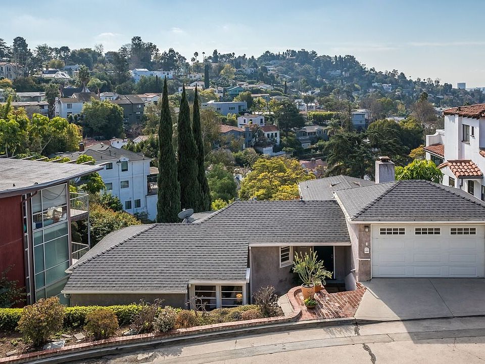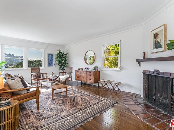Tucked away on a street-to-street lot, on one of the most sought after and quietest streets in all of Silver Lake, high in the hills of the coveted Moreno Highlands, this 3 bedroom, 2 bathroom quintessential Silver Lake charmer will take your breath away with its panoramic views of the surrounding hillside and beyond. The gracious living room with peg and groove wood floors and romantic fireplace is the perfect setting to welcome friends and family to your new home. The main level includes a bathroom and two bedrooms. Each bedroom has wood floors under the new carpet, so they are ready to accommodate your personal preference for flooring. The larger bedroom has four windows with peaceful hillside views and two closets. You will enjoy entertaining in the open floorplan of the kitchen and dining area (with soaring vaulted ceilings!) that flows seamlessly out to the large deck with built-in seating, perfect for enjoying the breathtaking sunsets over the city (and No Powerlines to block your views---rare for LA!). On crystal clear days, you can even see the ocean! As you head to the lower level, you will find a magnificent bonus space, the ideal spot for your home office, yoga/meditation room, art studio, child's playroom (or anything else your mind can conceive that makes this space a perfect fit for your unique lifestyle). This room has a keyed sliding glass door allowing for plenty of light and access to a small deck. Steps down is the third bedroom/flex space. It has a full bathroom with a separate shower, large soaking tub, and built-in vanity. This space has its own private keyed entrance, and a bonus enclosed sunroom, filled with windows looking out to the gorgeous backyard. This generously sized space can be so many things: your private primary retreat, an inviting separate guest space, a comfortable mother-in-law suite. Most of the living spaces throughout this unique home provide direct access to additional outdoor areas to entertain or relax such as the spacious brick patio with a stunning stone fireplace and charming built-in seating area. If you are craving even more outdoor space, there is a multi-level terraced yard with mature foliage, two avocado trees, an orange tree, and space for kids (or the kid in you) to explore. There are also a few special places in the lower yard that are perfect for chairs and a small table to enjoy a luxurious, private morning cup of coffee, soothing meditation time, or an evening beverage to end your day. Located in the sought-after Ivanhoe school district and minutes to restaurants, shops, the reservoir, and the dog park, this hideaway is classic Silverlake!
