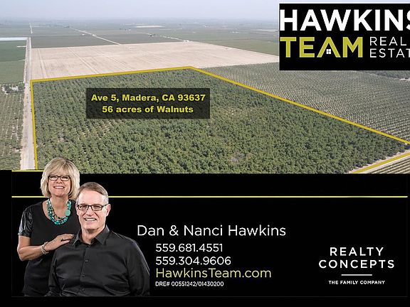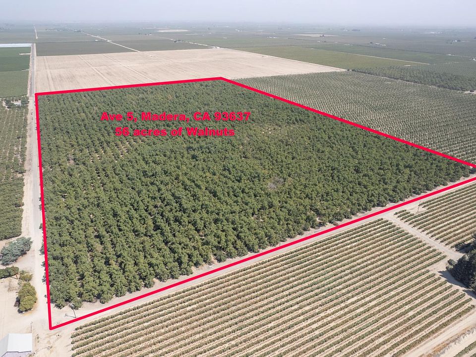 Prime opportunity to acquire a productive walnut ranch in Madera County. This 56-acre property is planted with mature Howard variety walnuts, trees are 25 years in age and well cared for. Located within the desirable Madera Irrigation District, the ranch benefits from both efficient micro-sprinkler irrigation and underground concrete for flood irrigation .Established production make this a turnkey investment for growers or ag investors. Conveniently situated at Avenue 5 and Road 24, this ranch offers long-term income potential in one of California's most productive farming regions.