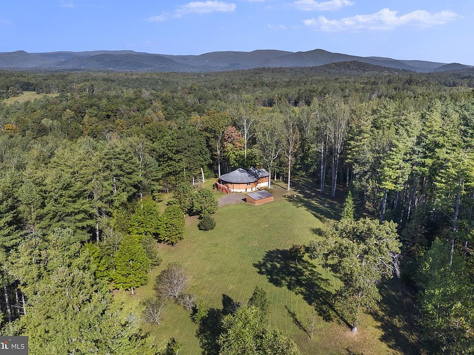 Price improvement! Think outside the box, quite literally, with this exquisite 4,000 square foot Deltec "round house" in the heart of the Piedmont. Rethink what a “cabin in the woods” can be. The circle has long been an important symbol in many cultures and this unusual home blends the exotic and the familiar with seamless grace. The efficient design features a panoramic, curving wall of windows that brings the outside in, along with a modern, comfortable interior. This unique property invites one to explore slowly, as its many charms are not immediately apparent. Approaching the front door, the enormous wrap-around deck invites an impromptu detour to take in the view of the Blue Ridge Mountains. Get a front row seat to the never-ending circle of changing light, weather, and seasons of the Blue Ridge. Turning back towards the front door, a flash of red at the edge of the woods catches the eye. This is the Torii gate, leading to the hidden meditation pond. What a delightful spot to sit, breathe, and release the stresses of the day. Indoors, the wide-open great room greets arrivals with a long, curving wall of windows. The outdoors feel like they are part of the indoors here. The great room is a gleaming expanse of cherry floors, designer lighting, high ceilings, and oversized windows. The centerpiece is the gourmet kitchen. Literally at the heart of the home, the kitchen is strategically placed to allow gathering while not impeding the cook. To one side is the open expanse of living area while to the other is the equally open dining area. The kitchen has maple cabinets, stainless steel appliances, and ample granite counters. The large island has a separate prep sink, built in wine rack, cabinets with pull-outs, and space for bar stools. Next to the main sink is a clever butcher block on wheels that tucks under the counter when not in use. The built in pantry is a marvel of accessible storage. Just beyond the great room is a bright, airy bonus room with a glass sliding door and cathedral ceiling. This flexible space would lend itself to use as a media room, office, library, overflow guest room, or all four. The primary bedroom is tucked behind the kitchen and features a cedar walk-in closet and inviting ensuite bath. There is a soaking tub, shower, and heated towel rack for extra luxury. On the other side of the kitchen, the second bedroom is down a short hallway that contains the second bath. This bath repeats the beautiful tile work, complete with river stone inlay and heated towel rack. Next door is the convenient main floor laundry. The full basement has ductwork is in place and roughed-in plumbing for a full bath plus an extra sink. Perhaps a future wet bar or an art room? The septic system is sized for 3 bedrooms, so one could be added on this level. The high ceiling reveals the secret to the round construction: a steel central support post with all floor joists meeting in the center. The circular design provides not only unmatched structural strength but also energy efficiency. Maples lining the driveway provide a graceful green shade in the summer and blazing color in the autumn. The many cherries and other blooming trees put on a spectacular show in the spring. The long front lawn is an expanse of green, dotted with specimen trees along the edges. Just downhill of the house, a path through the mountain laurel invites exploration further afield. Follow the path downhill through fern-covered glades and it reaches a mountain stream, a tributary of the Thornton River. Meander back to the house in time for sunset. The low angle of light streams through the forest onto the deck, as the sinking sun reflects in the windows. Settle in for the evening and watch as the sun sets over the Blue Ridge after another perfect day in the heart of the Piedmont. Experience the circle of day to night, season to season, with this unique circular home to anchor it all.