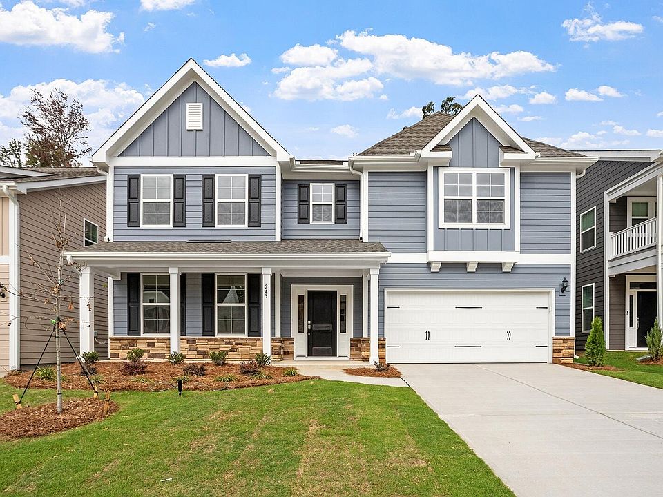 The Yates floor plan is a sight to behold. This expansive home combines modern elegance with a traditional layout. There is an expansive family room that opens up to a light filled SUNROOM. The chef-inspired kitchen boasts a stylish butler's pantry, guiding you to an elegant dining room with exquisite, coffered ceilings--a space destined for lavish entertaining and cherished family moments. The designated office provides privacy for productivity. Nearby, the first-floor guest suite, is ready for visiting loved ones. Ascend to the second floor to discover four additional generously sized bedrooms, including a magnificent primary suite featuring a large sitting area and a spa-like bathroom. Entertainment thrives in the spacious loft, perfect for lively family game nights and bonding. Experience the pinnacle of luxury living at scenic Georgia's Landing within minutes of shopping, dining and Downtown Raleigh. Visit today!