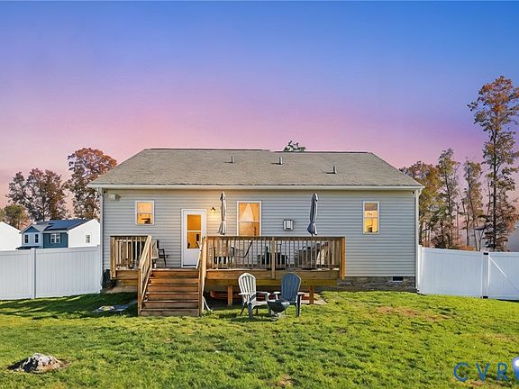 LESS THAN 2 YEARS OLD WITH ONE OF BEST BACK YARDS IN CENTRAL CROSSING! You won't want to miss this TURN KEY 3 bedroom ranch style home with upgrades galore! This beautiful one level home features an open concept layout with tons of natural light. Luxury Vinyl Plank Flooring throughout all of your main areas including the foyer, living room, kitchen, and bathrooms. Updated light fixtures including modern farmhouse touches, recess lights, and ceiling fans in every room. Cozy living room with custom panel wall and gas fireplace. Large kitchen with dining area, stainless-steel appliances, large island with storage, granite countertops, pantry, and easy access to the back deck. Laundry room with built in shelves for added storage. Retreat to the large primary suite, complete with a walk in closet and en-suite bathroom with quartz counters and dual sinks. large linen closet, and a stand up shower. Two additional carpeted bedrooms with ceiling fans and guest bathroom with tub/shower. Large two car garage with 12ft ceilings and pull down attic access where you can find additional storage. Custom blinds throughout and upgraded tinted windows for improved energy efficiency, UV filtering, and privacy. Backyard you will find lots of entertaining space with a custom built 12 x 22 deck and a flat landscaped backyard with plenty of room for your children or animals to play. Fully fenced with white vinyl privacy fencing and gate. Covered front porch with outdoor lighting. Full Yard Irrigation System to Keep the Grass Green. High speed internet available ready for you to move in!! Located in Central Crossing community close to restaurants and shopping with easy commute to Richmond, Mechanicsville, the Middle Peninsula, and the Northern Neck! Plus you can even go fishing in the community pond! Come and make this home your own!