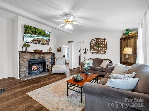 Great location with no HOA restrictions or fees. This immaculate home sits high and dry on 2 parcels with a combined acreage of just over 1 acre bordered by Bills Creek at the front of the property. One owner manufactured home with gabled ceiling living room with wood burning fireplace. Three large bedrooms, two full baths, spacious kitchen with newer appliances and a separate laundry room. Brand new luxury vinyl plank flooring throughout. Covered front porch overlooking the level, fenced front and side yards with an awesome area for a fire pit. Adjoining the parking area is a storage shed for all your outdoor tools. Located within minutes from Apple Valley golf course and Rumbling Bald’s public amenities without the restrictions and dues, and close to the town of Lake Lure and grocery shopping. Perfect opportunity to be close to the action without being on the outskirts of town!