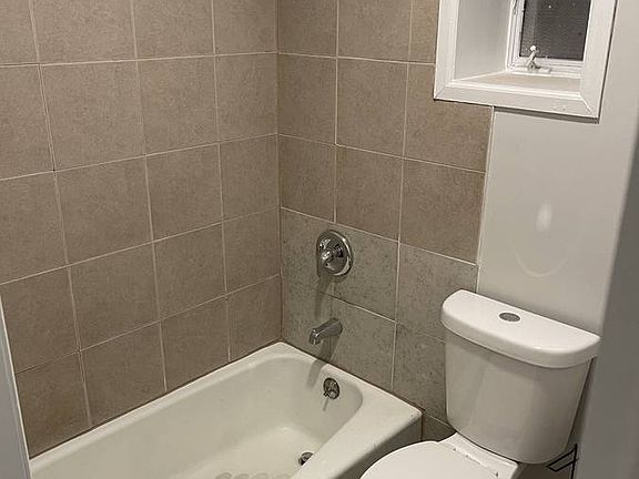 The bathroom has been recently renovated with a new tub/shower and toilet.