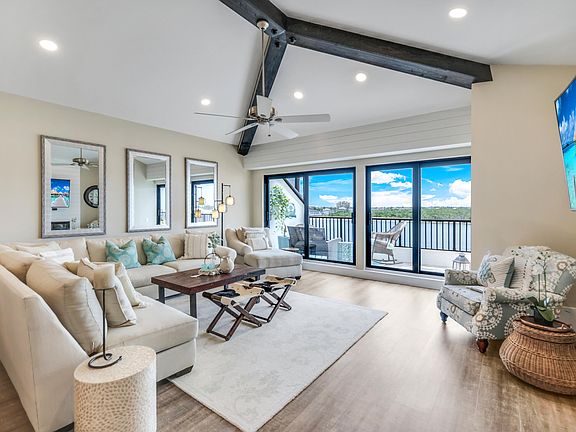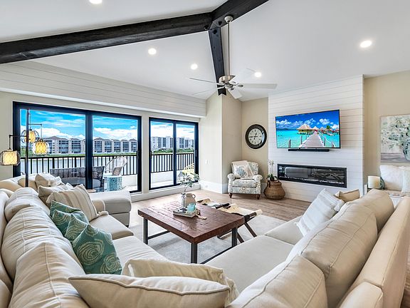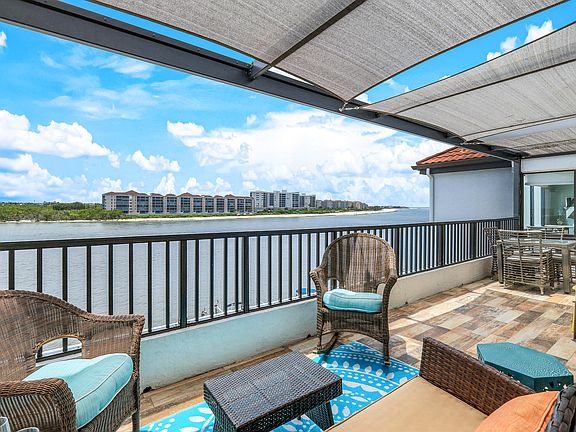 This recently remodeled top floor unit sits along the Marco River and has features that will captivate. The highly desired fourth floor unit with a vaulted ceiling in the living room features a two bedroom, two and a half bath configuration, allowing for both bedrooms to have en-suite. Recently remodeled throughout with coastal contemporary as the inspiration, you will feel the relaxation as you step into the space. The open kitchen with all new stainless appliances (GE and Bosch), kitchen cabinets and tile backsplash create a modern coastal space. New light fixtures and ceiling fans throughout add additional touches of modern luxury. The safety and low maintenance of all impact doors and windows speak to trouble free living for many years to come. Amazing sunsets and wildlife from your top floor private lanai are almost daily events. With a panoramic view of the Marco River and Marco Island plus a bit of the Gulf from the lanai, it's the perfect private relaxation spot. La Peninsula features a community lap pool with spa, fitness room, and various racket courts (Pickleball coming soon). Also, the potential for a boat dock exists right outside your unit (purchased separately when available). All located on the tranquil Isles of Capri - One of Naples best kept secrets. Come see this unit - you will not be disappointed!