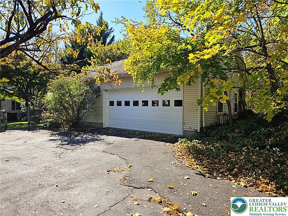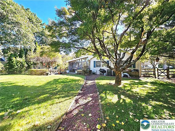 Nestled on a quiet dead-end street in the charming borough of Riegelsville, this classic Colonial beautifully blends historic character w/modern versatility & timeless curb appeal. Inside, the formal living room features gleaming hardwood floors & a cozy wood-burning fireplace, perfect for gatherings on cool evenings. The formal dining room opens to a private side patio, ideal for outdoor dining. The spacious, modern kitchen boasts a vaulted ceiling, tile countertops, & an eating nook, w/easy access to the screened 3-season room overlooking the private, fenced yard. The main level also includes a family room, den/office, and library w/a separate entrance, offering exceptional flexibility. A bedroom & kitchenette create an ideal space for multi-generational living or au pair suite, complete with its own deck for warm-weather enjoyment. Upstairs, the large primary bedroom is joined by 3 additional bedrooms & a full bath w/vintage tile, blending charm & comfort. The lower level has a cozy family room w/bar & Bilco access to the outdoors. Enjoy the oversized 2-car detached garage w/workbench & ample storage, plus lovely grounds featuring decking, koi pond, & lush plantings. The main home offers oil heat & central air, while the attached suite features a mini-split and elec. BB. A rare find in Upper Bucks County, this spacious, flexible home is perfect for multi-generational living or anyone seeking peace, privacy, & small-town charm just minutes from the Delaware River.
