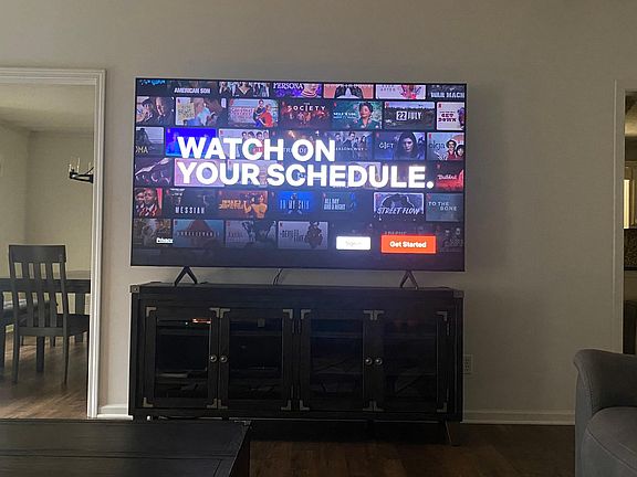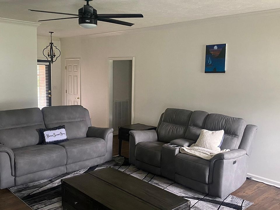 - Living room fully furnished - sofa/couch, love seat, tv stand, center pull-up table, 80 inch tv