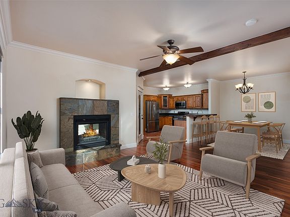 Experience easy, low-maintenance living in this beautifully maintained SINGLE-LEVEL condo in Bozeman’s desirable Valley West neighborhood. Thoughtfully designed with comfort & functionality in mind, this home features 9’ ceilings, alder cabinetry, wood, tile & slate flooring, and an open-concept layout that flows seamlessly between the kitchen, dining & living areas. The kitchen offers granite countertops, stainless steel appliances, ample storage, ans a large island with bar seating, while the living room centers around a dual-sided fireplace that extends to a covered outdoor patio, perfect for relaxing and/or entertaining. The private primary suite includes a walk-in closet & ensuite bath with dual vanities & a tub/shower combo, complemented by two additional bedrooms with mountain views & a full guest bath. A laundry area with upgraded washer/dryer adds convenience, and the detached OVERSIZED 2-car garage provides plenty of space for vehicles & gear. Enjoy access to Valley West’s community parks, trails & ponds, plus close proximity to dining, shopping, Montana State University, AND endless outdoor recreation including fishing, skiing & more.