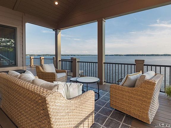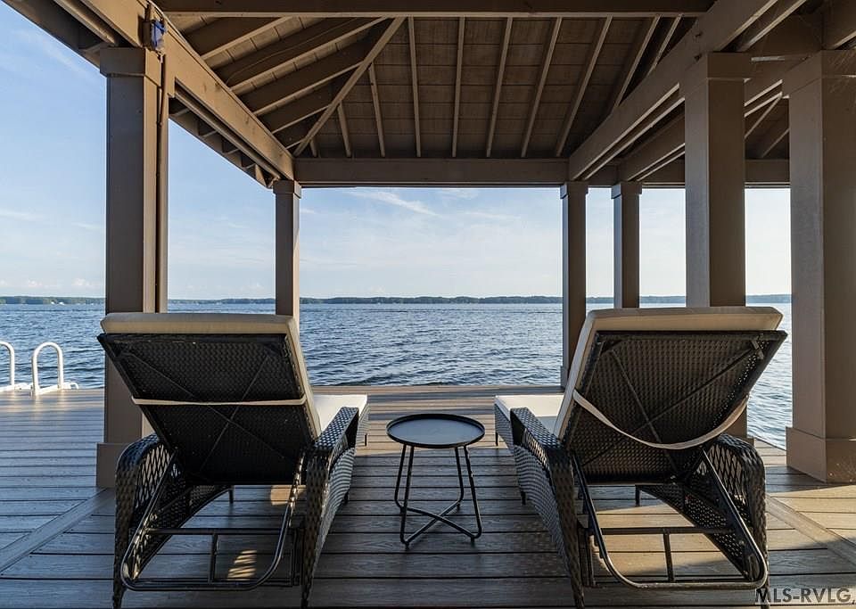 Perfectly positioned overlooking the widest, most expansive section of Lake Gaston, this gorgeous exquisitely styled and furnished newly constructed custom home offers breathtaking sunsets for an unmatched lakeside lifestyle! From the moment you step inside, you're greeted by a stunning open layout that seamlessly blends elegance and comfort. Soaring cathedral ceilings with exposed wood beams, dramatic fieldstone fireplace, finished-on-site white oak floors, upgraded trims and designer touches throughout create a warm, timeless atmosphere drenched in natural light. The heart of the home is the chef's dream—featuring custom cabinetry, stainless appliances, and a spacious butler's pantry—perfect for entertaining in style. The main-level primary suite is a luxurious peaceful retreat with a cozy reading nook, tiled bath, and generous walk-in closet. Guests will appreciate the spacious bedrooms, while additional living spaces include an elegant dining room w/ 12' ceilings, a versatile lower level with large recreation room, wet bar, dedicated gym or theater space, private waterside office, and a second waterside primary suite. Outside, the natural stone exterior makes a striking statement, while expansive waterside porches and large patio provide the perfect backdrop for entertaining or relaxing as you take in panoramic lake views and spectacular sunsets. A large double boathouse with deep water access completes this exceptional lakefront package. Whether you're seeking a tranquil escape or a stunning gathering place for family and friends, this rare main-lake gem is truly turnkey—offered fully furnished and exquisitely styled, ready for you to enjoy from day one!