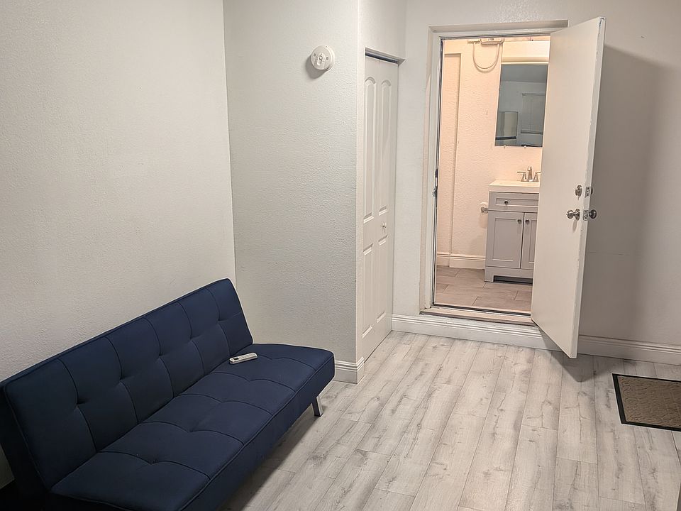 private entrance. with living room and closet. and private bathroom. comes with appliances refrigerator microwave small stove burner. private. All utilities are included comes with free Wi-Fi Netflix and Disney channel with additional channels. plenty living room space.