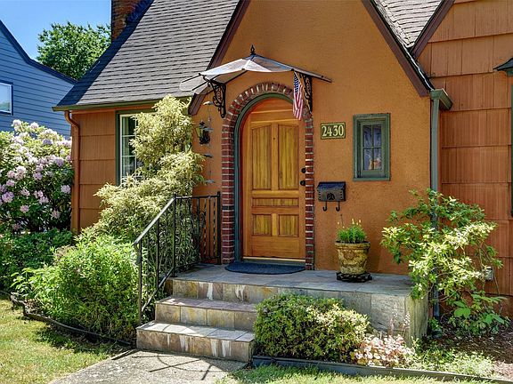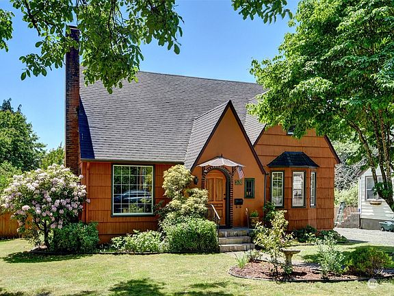 Well maintained Tudor style cottage in historic downtown Washougal. One bedroom on the main level, two up, including an en-suite master. Bonus room, laundry room and full bath in the finished daylight basement. Vintage details include original hardwood floors, arches, built-ins, crown molding throughout, and wood burning fireplace. The backyard includes a large covered deck perfect for entertaining, detached garage, shed, green house, and a fenced raised bed gardening area. Recent updates include a new 30-year roof (2017), new modern kitchen with quartz counters, gas stove, underlit cabinets, lighted drawers, and Bosch appliances. LG washer/dryer, heat pump AC. Wired for fiber internet. Lots of storage on every level. All appliances stay.
