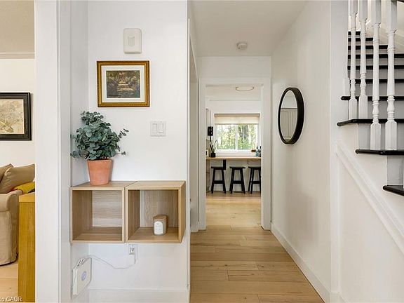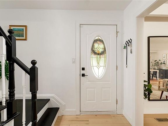 Welcome to this beautifully updated/renovated 4-bedroom, 3-bathroom, 2-storey home nestled at the top of a quiet court in Burlington’s popular Brant community. Private pie-shaped lot! Perfectly located in South-Central Burlington, this property offers a rare blend of tranquillity & convenience—just steps from restaurants, shopping at Burlington Mall, Winners, & Canadian Tire, with Spencer Smith Park on Lake Ontario, downtown Burlington, major highways, & the GO Station only minutes away. Set on a mature pie-shaped lot, the home features lush, manicured gardens framed with armour stone, a shade tree, & a welcoming front veranda. The double driveway & attached garage with inside entry add everyday convenience. The private backyard is a true outdoor retreat, boasting a stamped concrete patio for entertaining, a water feature, a custom pergola with hot tub, & a charming garden shed, new back fence, all surrounded by mature trees for ultimate privacy. Inside, natural light floods the spacious layout, showcasing hardwood floors across two levels, custom wall accents & built-ins, deep baseboards, updated bathrooms & a refinished staircase. The bright living room with bay window flows into a formal dining room with walkout to the patio, while the updated eat-in kitchen features quartz counters, wood cabinetry, & a coffee bar nook with access to the BBQ deck. Upstairs, you’ll find an updated 4-piece bathroom & 4 bedrooms with hardwood floors, including a primary suite with deluxe wall mouldings & dual closets. The finished lower level extends the living space with wide-plank laminate flooring, a family room with gas fireplace, a gym area, a 3-piece bath with a heated floor, & a large laundry/utility room with ample storage. New Furnace in 2024. Combining charm, style, & functionality in one of Burlington’s most convenient neighbourhoods, this home offers the perfect balance of modern upgrades & timeless comfort.