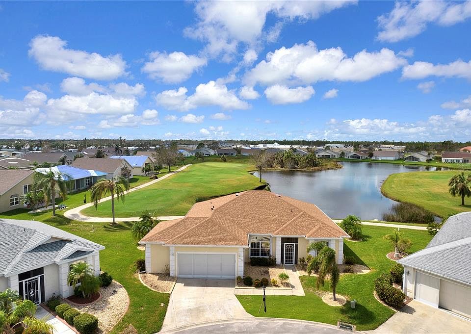 AWESOME water/golf course views with AMAZING SUNSETS from your expansive lanai at this home in the gated golf course/active resort of Kings Gate, a 55+ community. This home is perfectly located at the end of a quiet cul-de-sac and enjoys a 2 1/2 car garage that is currently configured as a 2-car garage and a work shop.