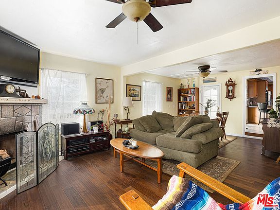 This home is spacious, with two bedrooms, a full bathroom, and a 3/4 bathroom. The living room offers a stunning wood burning fireplace with high-end, mildly distressed, laminated hardwood flooring. The dining area sits conveniently between the living room and the kitchen, with the same hardwood flooring.  The kitchen has been extensively remodelled, including addition of sculptured/vaulted ceiling, granite counter and breakfast bar, glass tile backsplash, soft close hardwood cabinetry, tile flooring and stainless steel appliances. Large laundry closet with folding doors in the kitchen will accomodate full-size, free standing washer and dryer plus all your cleaning gear. The primary bedroom is quite large with a walk-in closet. The second bedroom is standard size with a wardrobe closet. The 3/4 bath is contemporary, while the full bathroom is dated. This is a BIG lot and has a huge rear yard with trees, gardens, grape vines and more. In addition to the one car garage, there is a large, custom storage building for gardening, toys, etc.