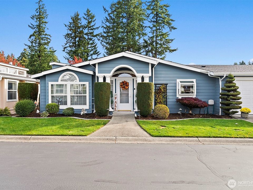 Welcome to Lake Wilderness Villa, a premier 55+ gated communities! This pristine 3 bed, 2 bath, 2,300 sqft rambler has a spacious layout and custom luxury upgrades throughout. The kitchen features granite countertops, custom cabinets, and a double oven. A striking double-sided fireplace with quartz surround in the living room connects to a versatile guest room/den. The spacious primary suite has a 5-piece ensuite, walk-in closet, and an office area. A/C, a private patio w/ retractable awning, plus a garden shed with power, are ideal for summer! Home is adjacent to visitor parking. Community amenities include a clubhouse, game room, gazebo, sports court, and putting green. Dining, shopping, and everyday conveniences are just minutes away.