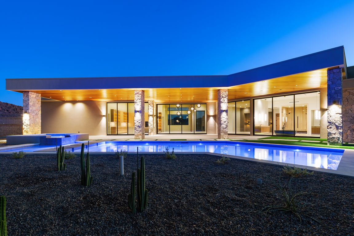 Resort-style pool and spaRift-sawn woodWine cabinetWalls of glassHidden oversized pantryCustom lit walk-in closetCustom stone counters