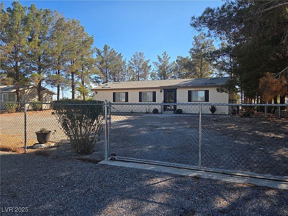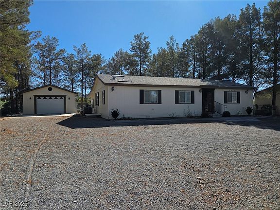 Beautifully maintained 2 bedroom, 2 bath home that feels like a model — warm, inviting, and thoughtfully designed throughout. Features luxury vinyl flooring, alder wood cabinets stained to cherry finish and solid wood doors, custom lighting, and an open-concept layout with a spacious living room plus separate den. The kitchen offers a large alder wood island with seating and stainless steel appliances. Craft room or office off the back patio adds ideal flex space. Enjoy outdoor living on the expansive back deck surrounded by mature trees and garden space — peaceful and private on a fully fenced ½ acre. Detached garage offers plenty of cabinet storage and a built-in workbench. Located on the desirable west side of Pahrump with easy highway access. Private septic. No flood zone. Low HOA includes community well. A turnkey gem! Call today for your personal tour!