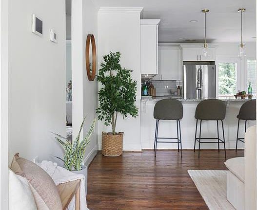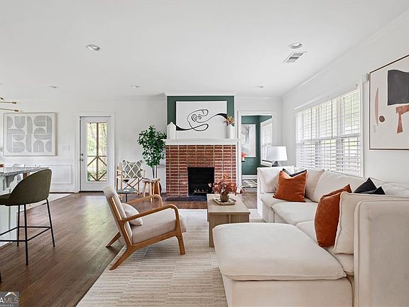 Charming brick fireplaceHardwood floorsDeck overlooking the backyardPlenty of workspaceLight-filled living spaceStainless steel appliancesLarge peninsula with seating