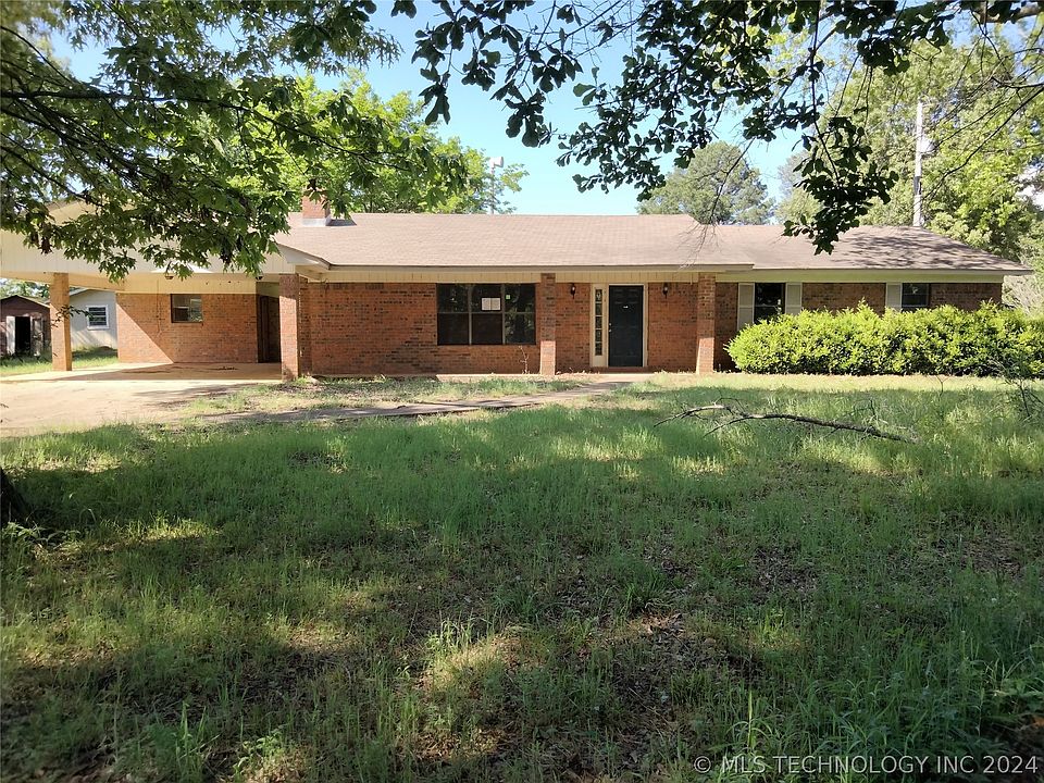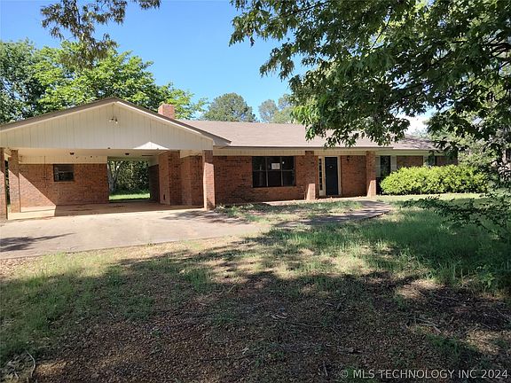 ALL OFFERS CONSIDERED!! Great location for this 3 bedroom 2 and half bath brick home at the edge of Hugo, OK. This home offers 5.06 acres of land, barn, outbuildings, attached carport and 1620 SF of living area in the house. The living room has a wood burning fireplace with insert. Kitchen and dining combo. There is a small office with a half bath in the back side of the carport area which is a plus. This property has many possibilities and is ready for your ideas. Come take a look! Sold AS-IS.