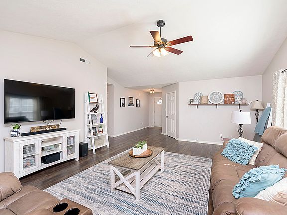 Adorable ranch home with 3 bedrooms and 2 full baths. This quiet & quaint neighborhood is perfectly located to many local amenities. The spacious family room features a vaulted ceiling with a fan. The kitchen opens up to a dining area with a bay window. Updated lighting in the kitchen and hallway. The primary bedroom also features vaulted ceilings and has an en-suite bathroom with a shower/tub combo. Two additional bedrooms with walk-in closets. The laundry room features shelves for storage and a folding counter above the washer and dryer. NEW flooring throughout the home. This home has a 2 car garage. Entertain outside on the extended patio overlooking the fenced yard.
