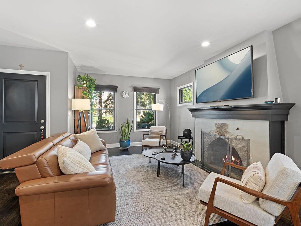 Gas fireplaceModern appliancesRec roomLarge custom walk-in closetLarge windowsCustom cabinetryLight-filled interior
