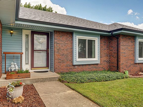 This one's been loved and it shows. Solid all brick home with great curb appeal, an inviting living room complete with a brick fireplace and solid wood built-ins. The primary bedroom has it's own private bath and a door that leads straight out to the backyard. The covered deck is the perfect spot to relax or entertain, with a fully fenced yard, raised garden beds, and even a little outbuilding with power. The roof, soffit, facia, and guttering were replaced in 2020, and there's updated sliding windows. Located near parks and trails, Horton Smith Golf Course, and many new shopping and restaurant developments. The kitchen fridge, all curtains, and antenna stay. No HOA, but there is an optional membership to subdivision pool.