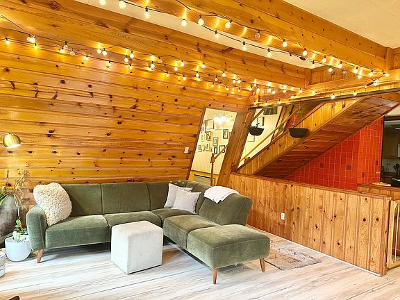 Escape to a truly unique A-Frame, custom-built by homesteaders in 1976 and nestled in a picturesque setting with easy access - fully furnished! Step into the spacious front entry and discover an inviting open living room, featuring warm tongue-and-groove accents with a cool retro-tiled backdrop perfect for cozy evenings. The updated flooring, modern furniture, and plants galore complete with a large pantry/mudroom for ample storage and direct access to the fantastic covered rear deck, ideal for year-round enjoyment with its private hot tub.