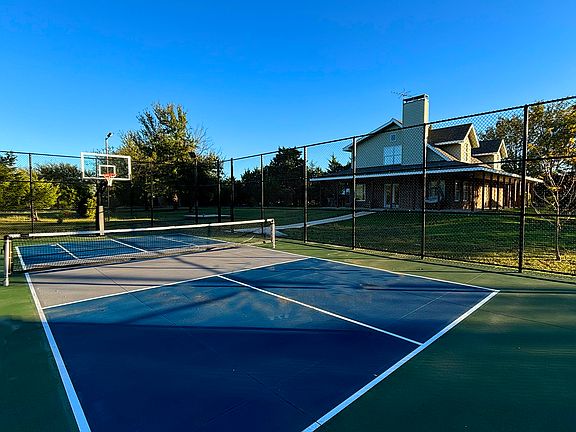 Basketball court goalLit pickleball courtCovered patioParking garageLarge covered carport