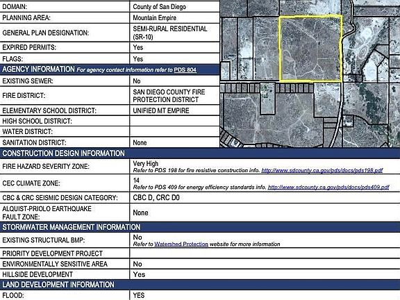 Rare opportunity: Large usable 38.31 acre lot in Tecate on the corner of Humphries Road and Emory Road. Slight slope, but generally level and usable. Semi-Rural Residential (SR-10); likely could build 3 residential homes at the moment; maybe more if zoning changes; County Holding Area to prevent premature urban or nonurban development; permitted uses are similar to A70. Any temporary use allowed by Major Use Permit; a variety of uses permitted. Confirm with County and your attorney on legal uses; see attached County Property Summary Report and in photos; buyer should verify all possible uses.